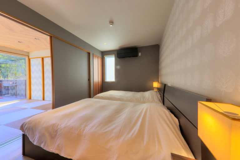 Furnished with four single beds, it’s great for families or groups. Each unit also features a private natural hot spring bath and a dedicated dining space, ensuring complete privacy and relaxation.