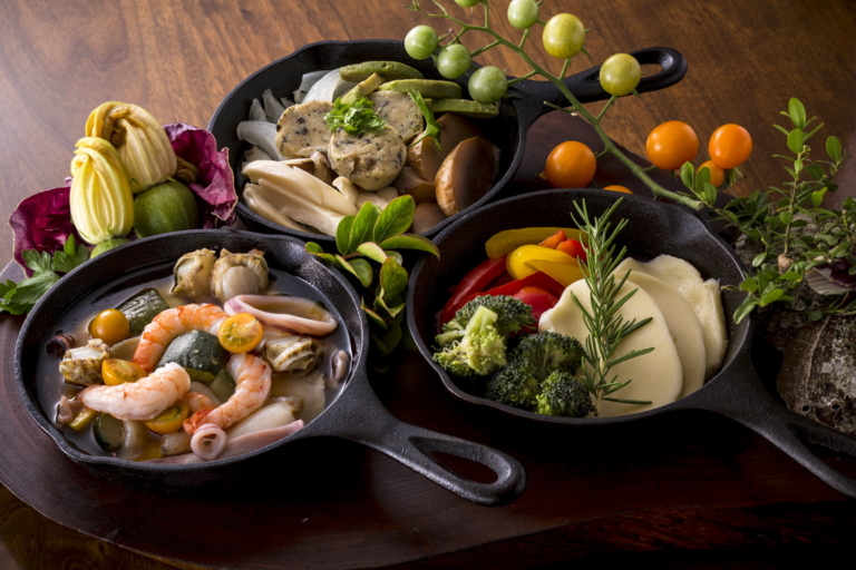 In this plan, guests can savor premium Yamanashi meats in a unique Western-style hot pot. The broth is infused with the aroma of rich red wine, enhancing the flavors of Koshu beef and Fujizakura pork served shabu-shabu style.