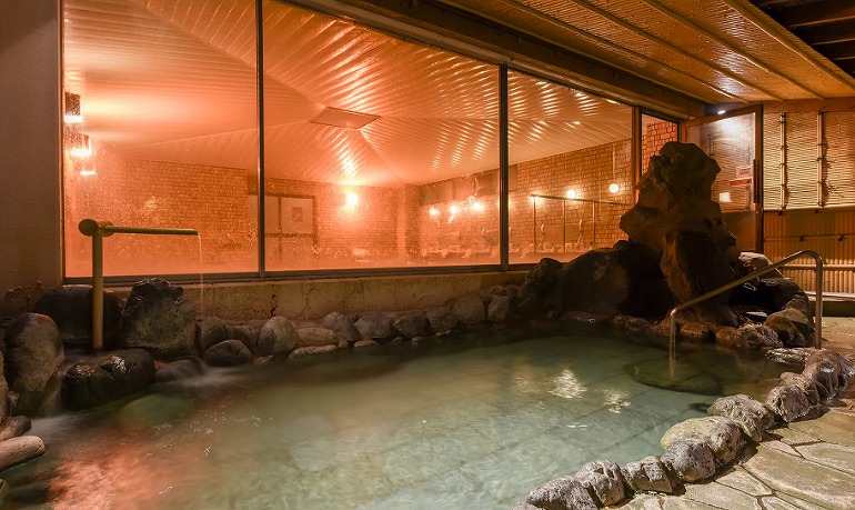 Guests can enjoy a variety of bathing experiences, including one of the largest rock baths in the prefecture, a garden open-air bath, and private panoramic baths.